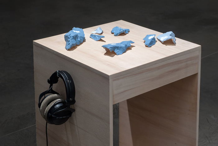 Au premier plan : Chambre avec nuages, ébouli, Pierre Feller, à l'arrière plan : Toucher pied avec les yeux, Axelle Glé