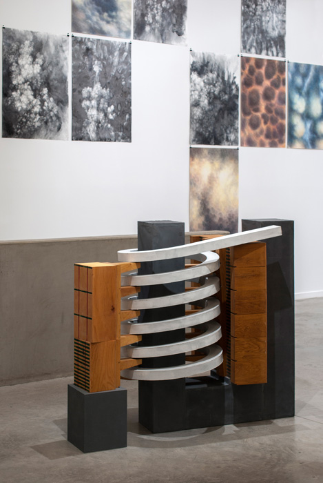 Les sculptures se présentent comme des constructions auxquelles s’accroche pour l’une d’elles une spirale à l’image des parkings à étage. Ces constructions/ouvrages d’art sont indistincts des socles qui les supportent. Ici, figuration et présentation ainsi s’entremêlent.