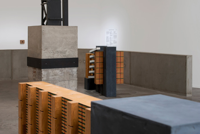 L’exposition Les Pièges consiste en une variation de sculptures modulaires qui mêlent les vocabulaires de la construction et de l’architecture à travers leurs deux matériaux de constitution : le béton armé et le voile de ravalement de façade.