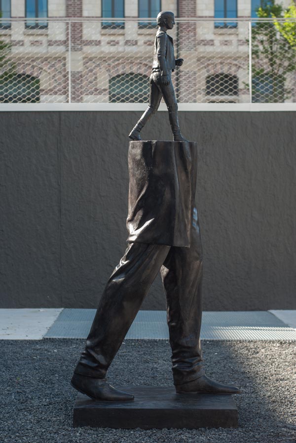 Nous voici devant l’étrange association de deux corps humains, ou plutôt d’une figure féminine (en bronze) prenant comme socle un tronc masculin (en béton). Leurs grandes enjambées forment des diagonales symétriques qui se répondent, et toute la sculpture respire le dynamisme.