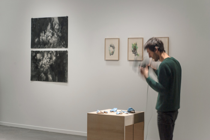 Les dessins de Mélissande Herdier nous montrent des nuées, mais aussi autant d’amas ou d’agrégats d’astres. La technique de bains et de dépôts successifs de poudre de graphite employée pour les réaliser renvoie à l’émulsion photographique argentique. Les dessins se font chambre noire, ils sont le lieu d’une captation et d’une révélation sensible de fictions d’espaces et d’entremêlement de l’artificiel et du naturel.