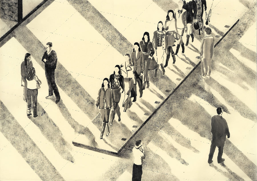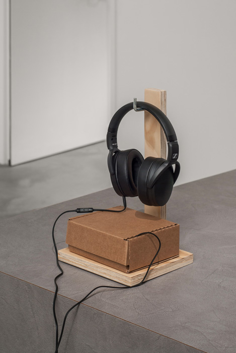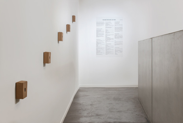 L’installation invite à une déambulation physique enrichie de points de vue différents : échelonnée, la série de sculptures module une spatialisation du lieu d’exposition et ouvre à une fiction contemporaine (dessin/tracé incluant une critique).