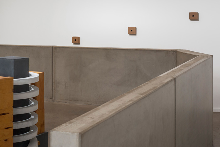 Les sculptures se présentent comme des constructions auxquelles s’accroche pour l’une d’elles une spirale à l’image des parkings à étage. Ces constructions/ouvrages d’art sont indistincts des socles qui les supportent. Ici, figuration et présentation ainsi s’entremêlent.