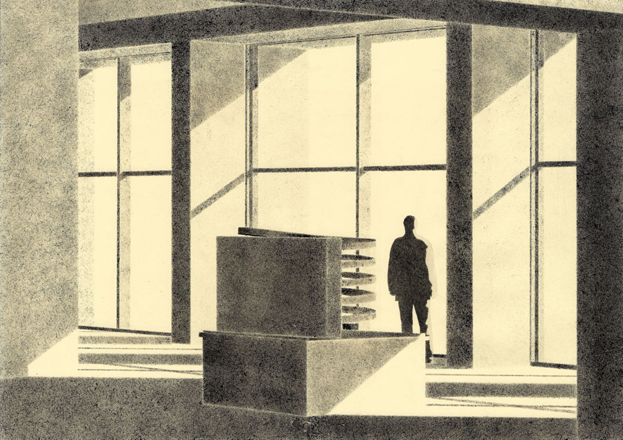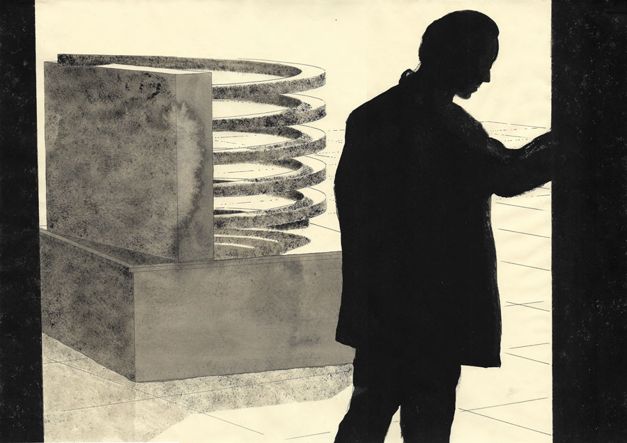 À cela s’ajoutent deux œuvres graphiques qui se font face : un dessin figure une sculpture en spire, elle apparaît comme une troisième pièce possible pour l’exposition, et une image de synthèse présente une exposition dans un lieu fictif, un grand hall au sein duquel une sculpture en colonne profite d’une lumière venant d’un mur vitré construit par tenségrité.