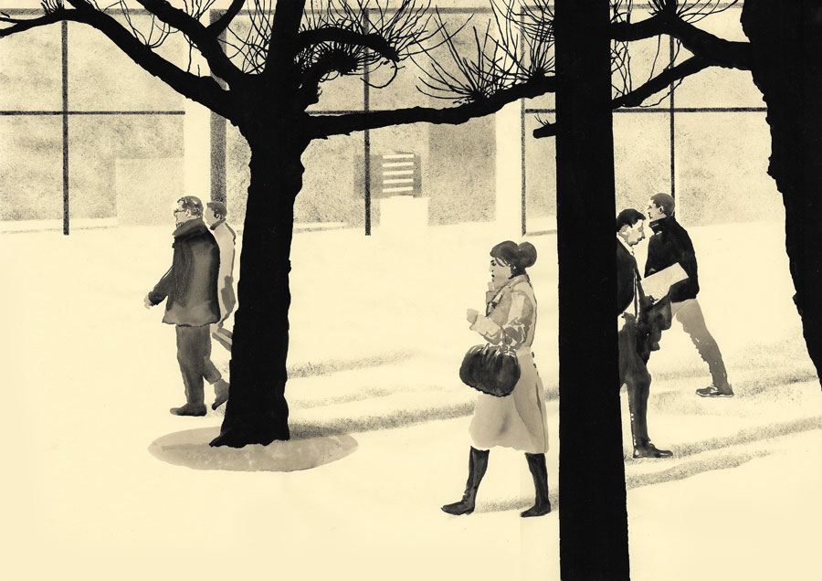 En dessin, la mise au carreau est l’opération qui a pour but de grandir une esquisse, d'exécuter une composition dans de grandes dimensions et d'après un modèle donné. Pour ce faire, on applique un quadrillage à l’esquisse, que l’on peut ensuite reproduire à des dimensions différentes, reportant du même coup ce qu’il recouvre à la nouvelle échelle choisie. La trame normée qui s’applique aux constructions figurées ici y fait référence et nous aide à envisager comment la modernité et ses suites ont donné une échelle mondiale à la modification des usages de l’homme. Mais aussi, partant, de l’environnement puisque les dessins sont comme autant d’objets monde où l’utopie devient dystopie, elle-même relevant d’une perception active de l’histoire, où architecture et atmosphère prennent un tour inquiétant et virent au cauchemar systématisé. Les dessins façonnent un état absolu de la ville, le cadrage resserré à une seule suite d’immeubles - comme une volonté de faire sortir hors-champ ce qui ne saurait devoir être pris en compte mais se rappelle à nous finalement. À l’homogénéité indifférente de l’architecture présentée, répond la vision catastrophique de l’atmosphère exacerbée qui l’enveloppe.